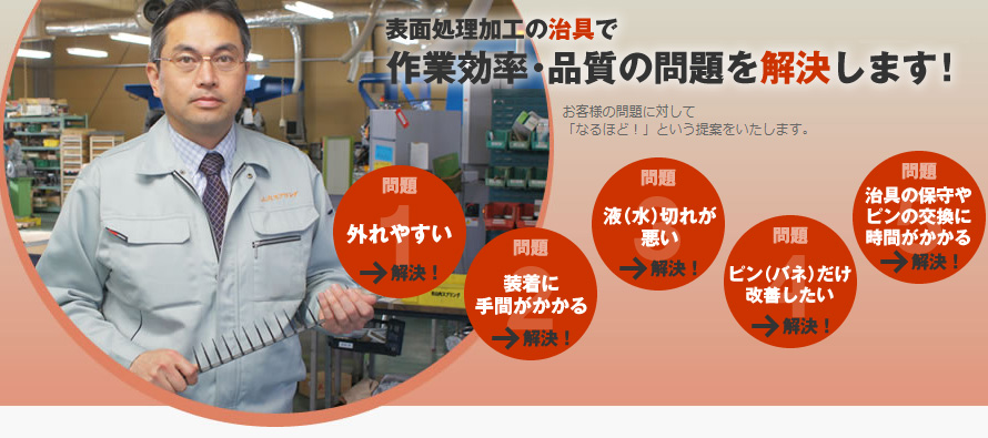 メッキ治具、塗装治具、IP治具、蒸着治具、コーティング治具、バレル研磨治具などの表面処理を改善するオリジナル治具の提案・製作